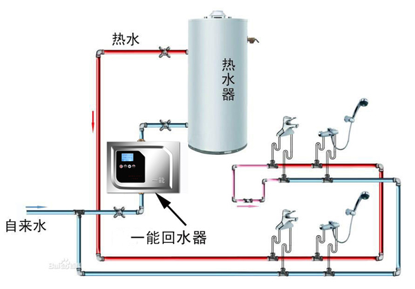 在距離熱水器遠端的用水端加裝一個回水管,同時加裝一個溫度感應裝置和閥門。當我們用水的時候打開水龍頭,通過溫度感應裝置感應,若是冷水,則打開閥門,讓冷水經過回水管流入熱水器進行二次加熱;當溫度感應裝置感應到熱水來了之后,立馬關閉閥門,水龍頭就流出了熱水。